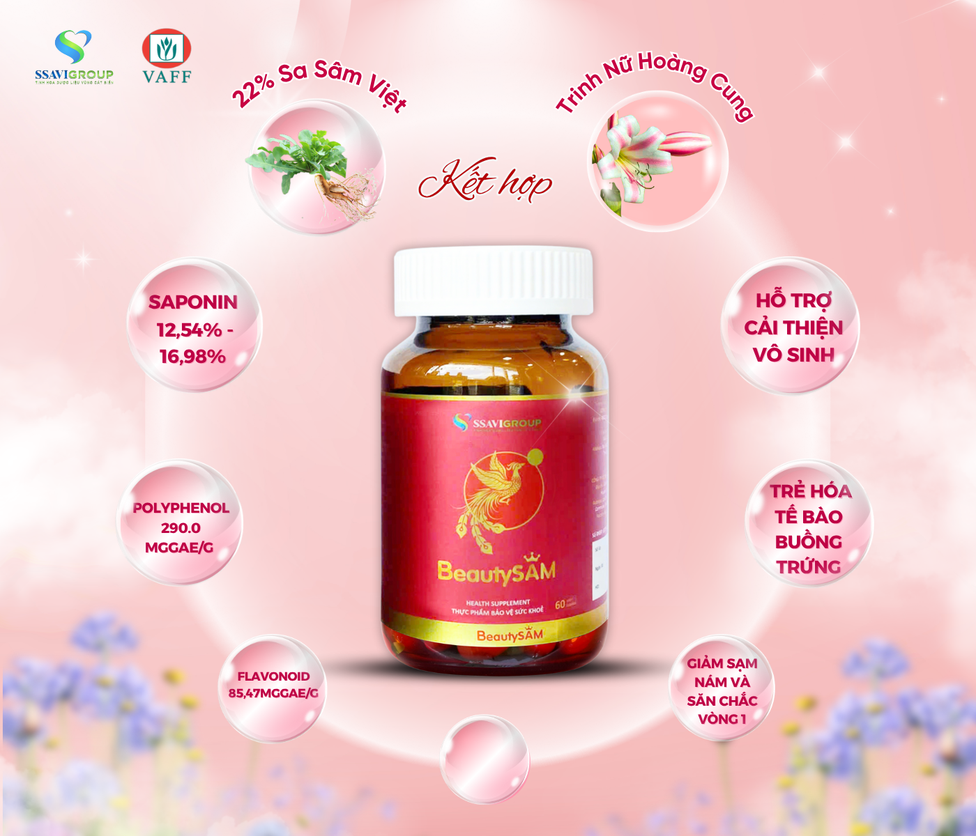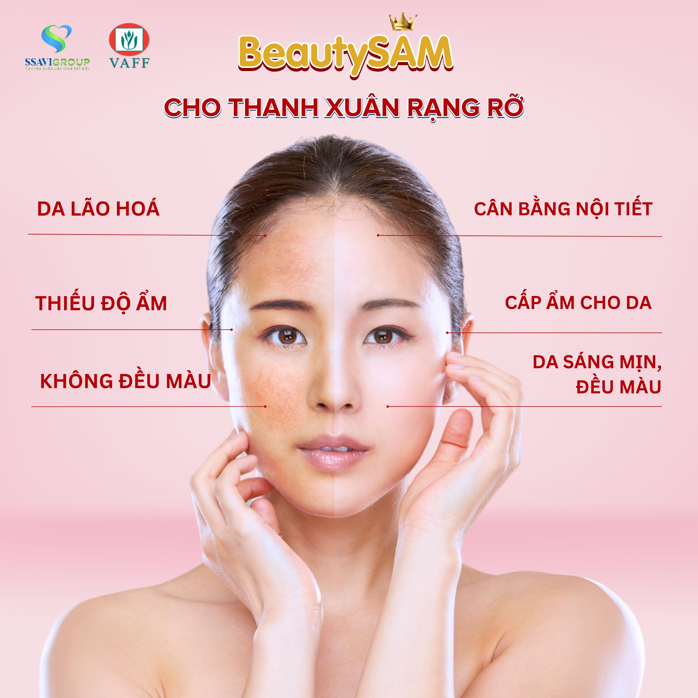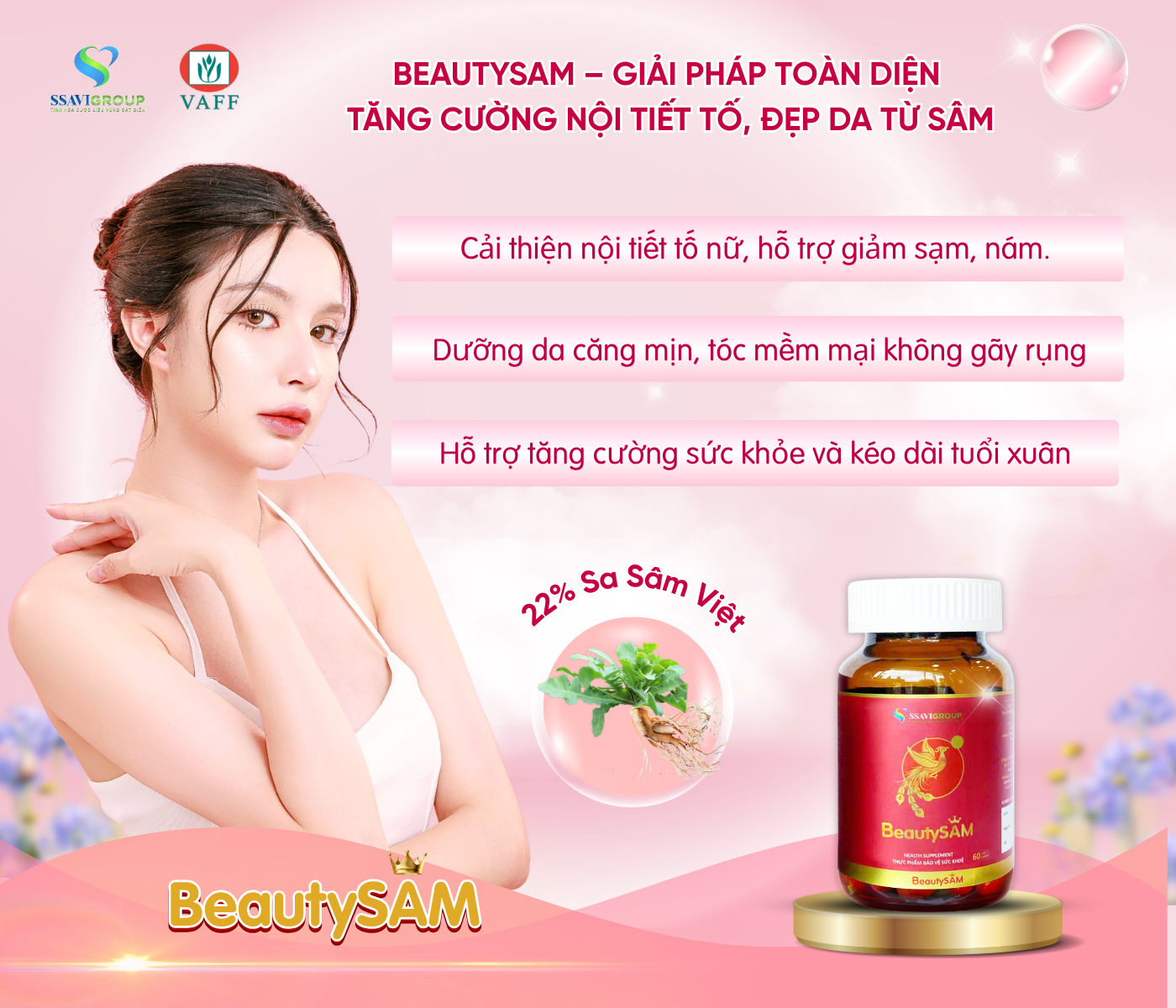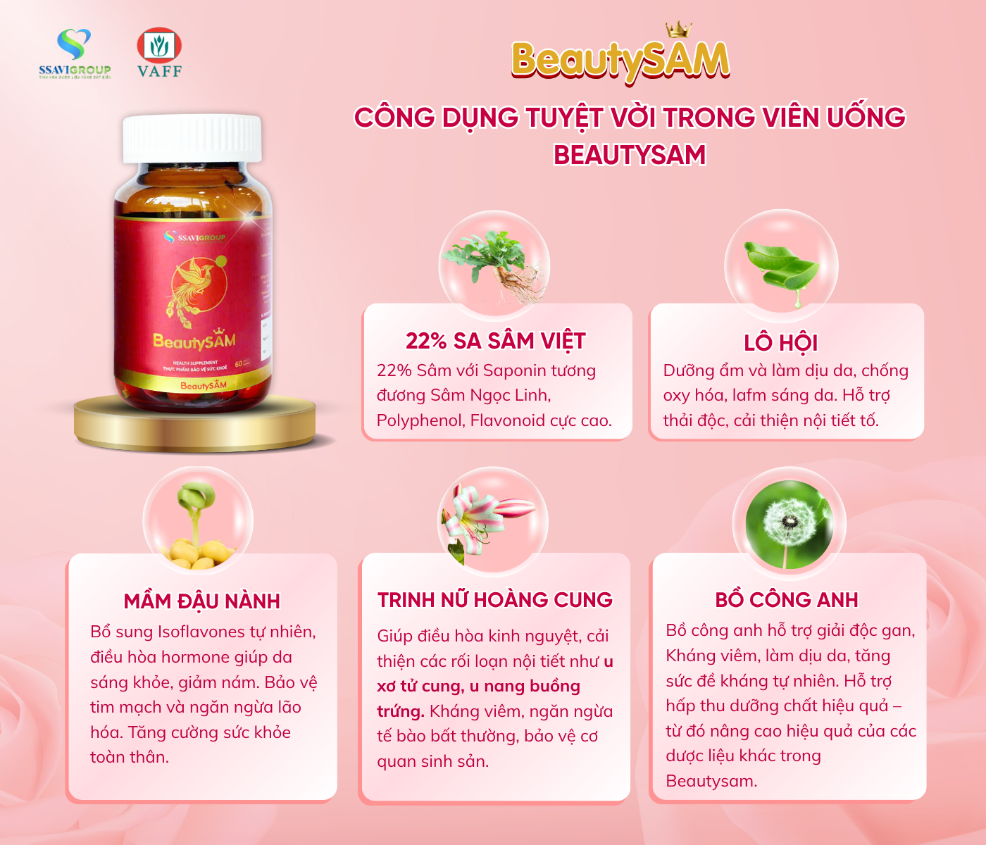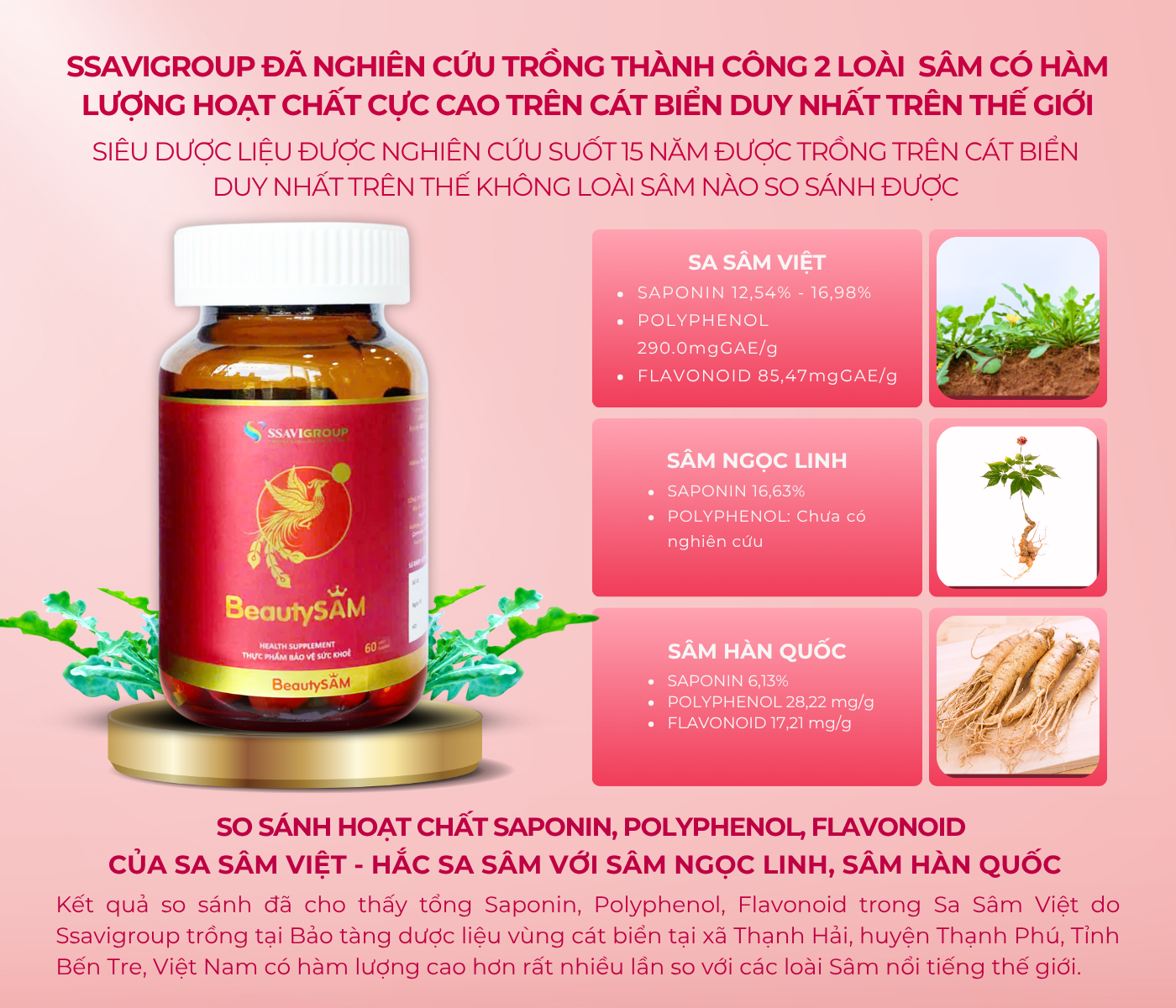 BeautySam do tập đoàn Ssavigroup - Doanh nghiệp khoa học công nghệ Việt Nam nghiên cứu, thành phần lên đến 22% "siêu dược liệu Sa Sâm Việt" có hàm lượng Saponin, Polyphenol, Flavonoid và nhiều khoáng chất thiên nhiên vượt trội so với những loại sâm danh tiếng trên thế giới, kết hợp mầm đậu nành, trinh nữ hoàng cung, bồ công anh, lô hội nhằm hỗ trợ cơ thể duy trì cân bằng nội tiết và vẻ ngoài tươi tắn cho phụ nữ từ tuổi dậy thì đến giai đoạn tiền mãn kinh.