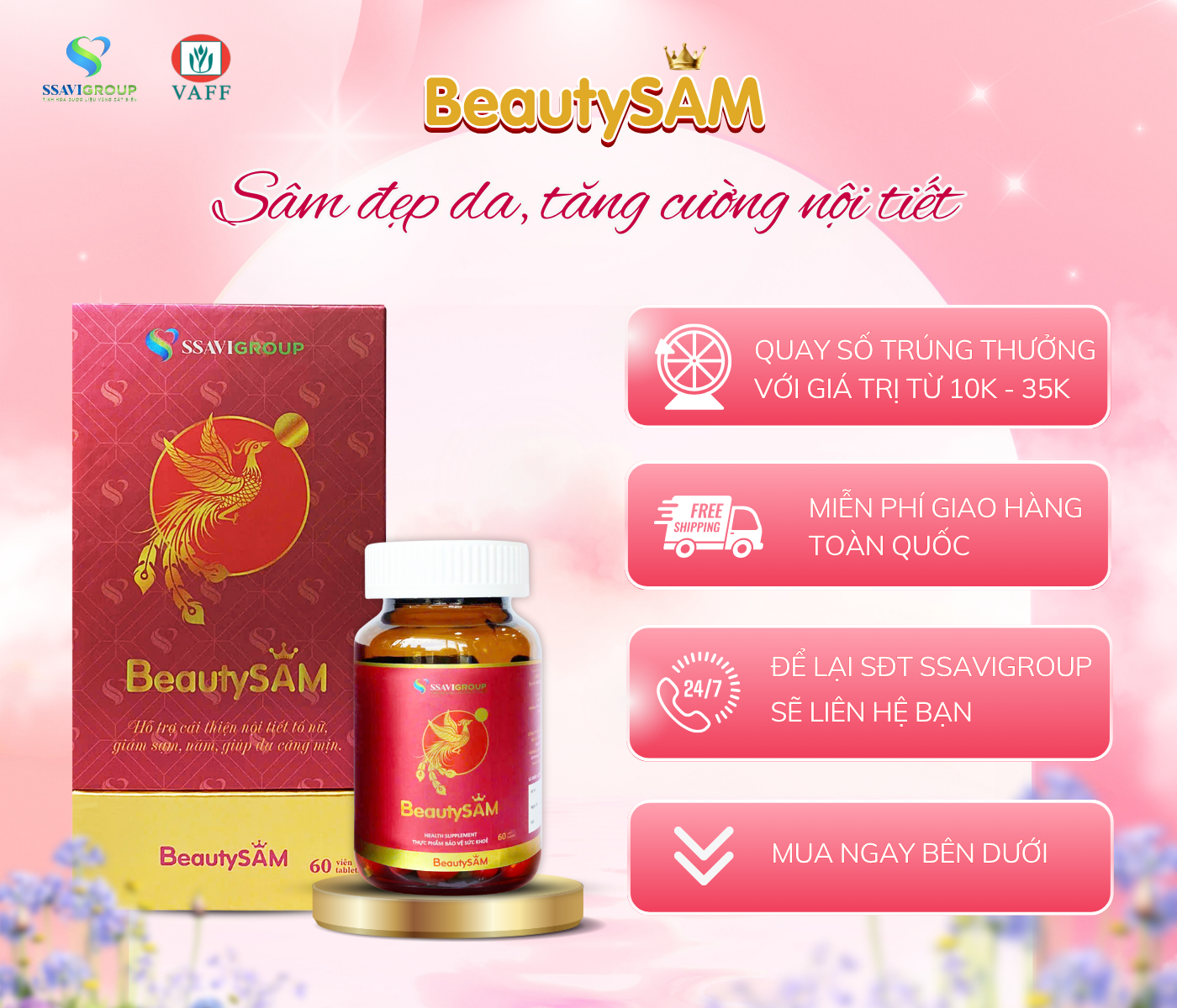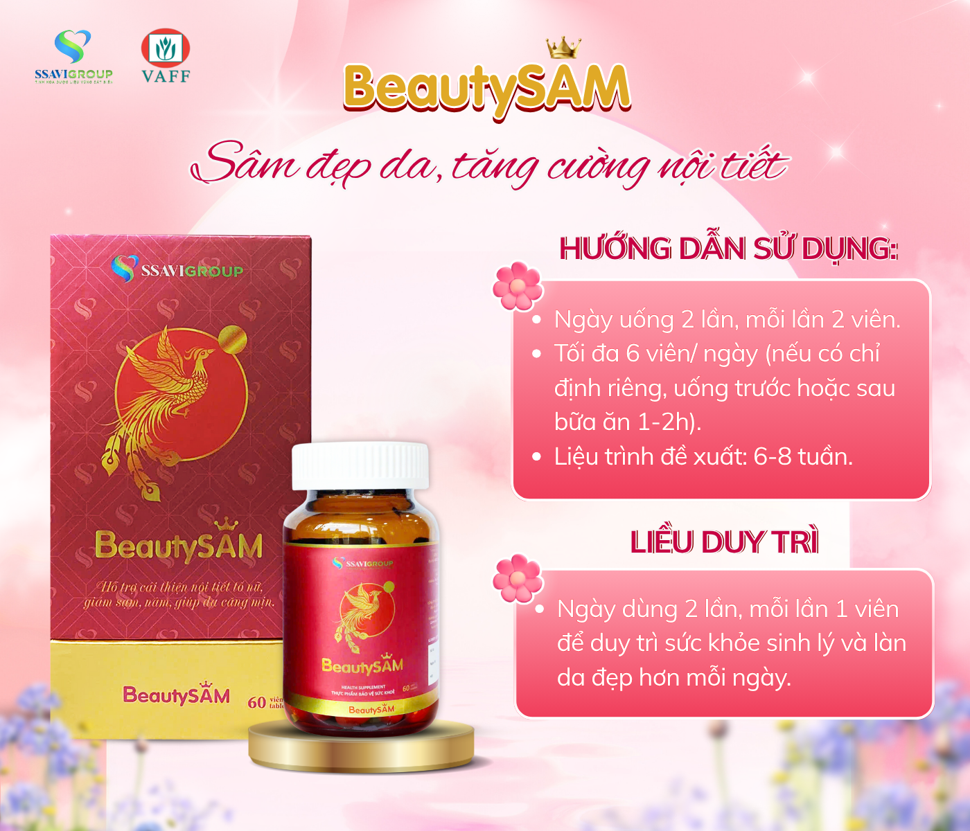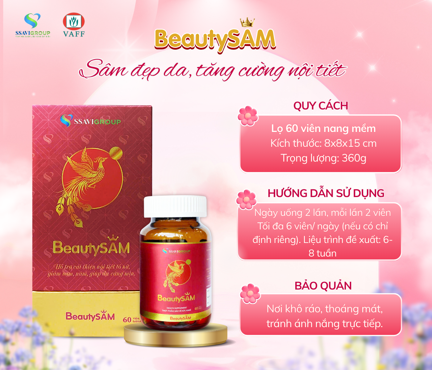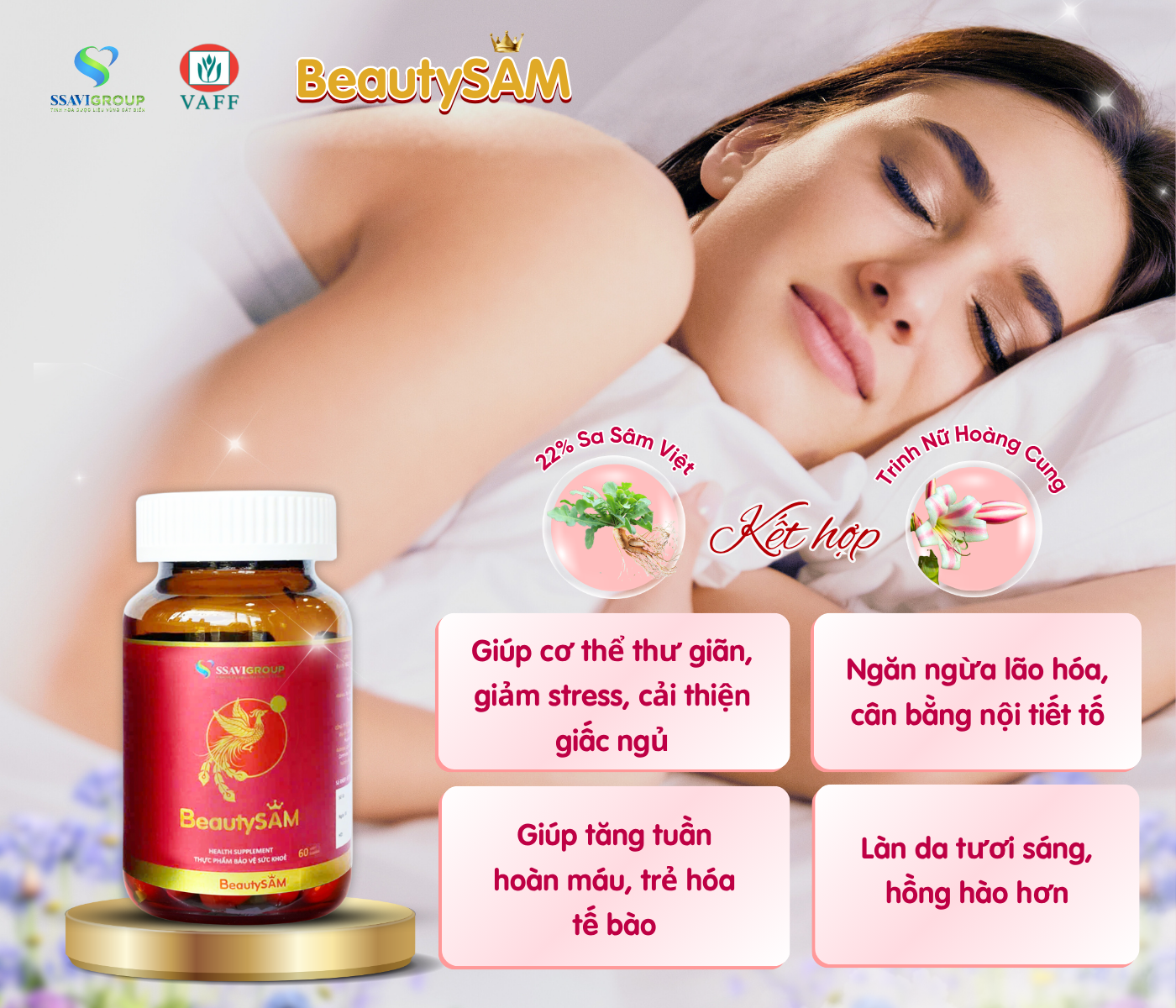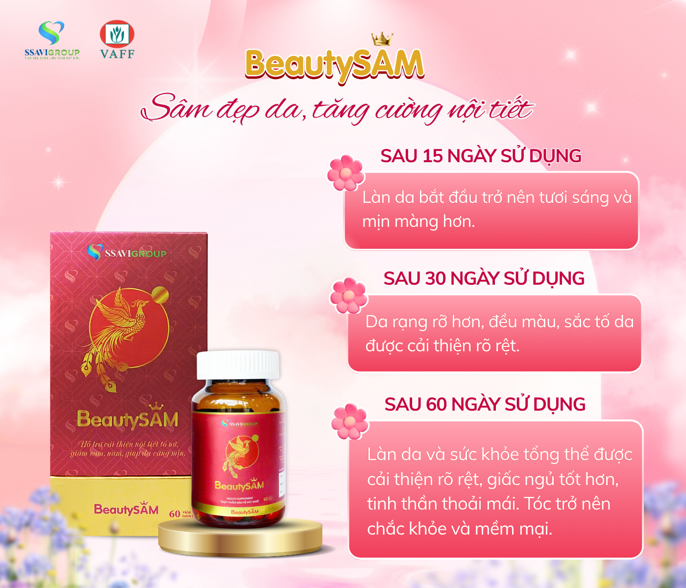 BeautySam do tập đoàn Ssavigroup - Doanh nghiệp khoa học công nghệ Việt Nam nghiên cứu, thành phần lên đến 22% "siêu dược liệu Sa Sâm Việt" có hàm lượng Saponin, Polyphenol, Flavonoid và nhiều khoáng chất thiên nhiên vượt trội so với những loại sâm danh tiếng trên thế giới, kết hợp mầm đậu nành, trinh nữ hoàng cung, bồ công anh, lô hội nhằm hỗ trợ cơ thể duy trì cân bằng nội tiết và vẻ ngoài tươi tắn cho phụ nữ từ tuổi dậy thì đến giai đoạn tiền mãn kinh.